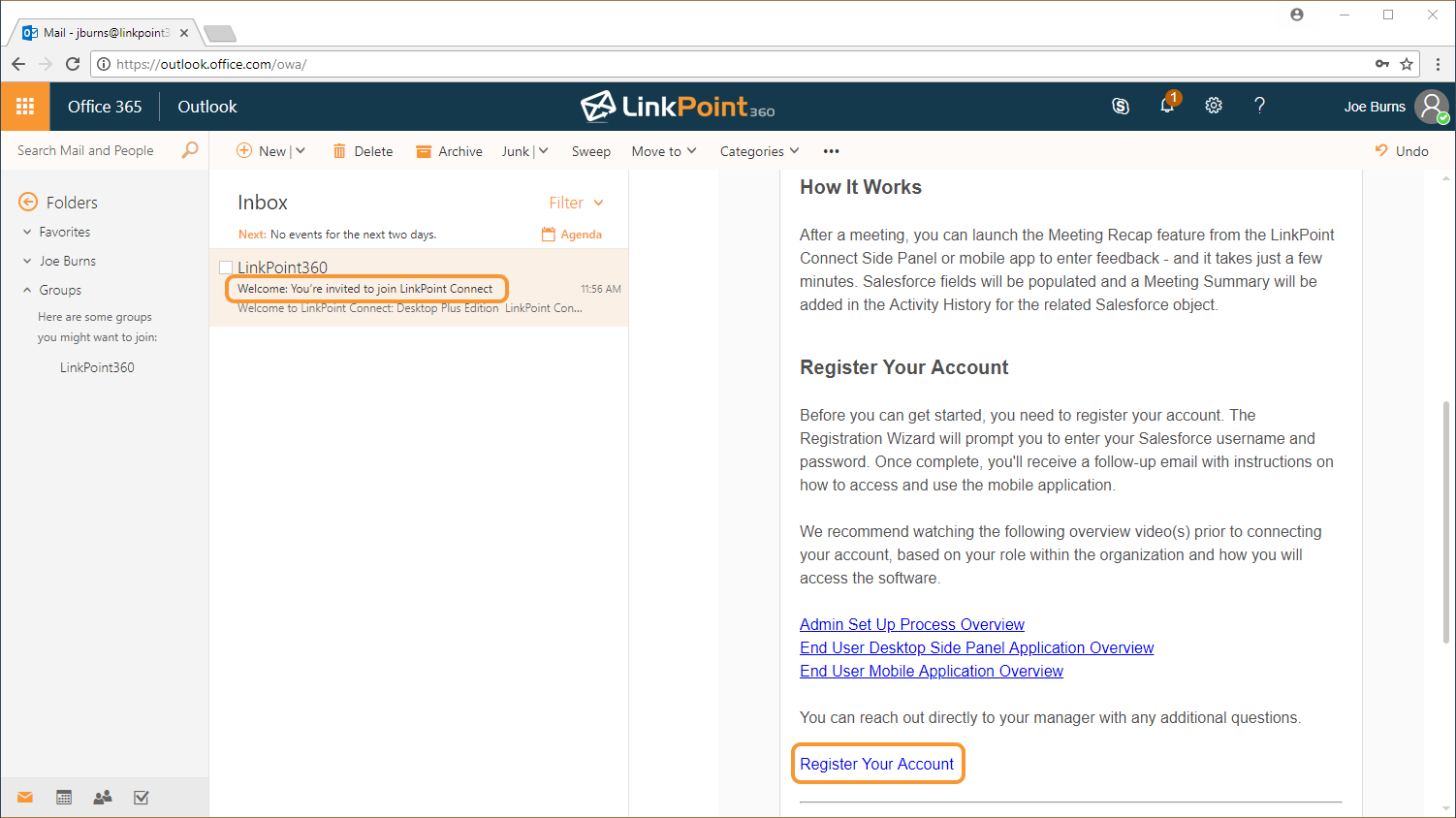 Check your email and locate the message with the Subject Line Welcome: You’re invited to join LinkPoint Connect. Select the link Register Your Account link in the email.