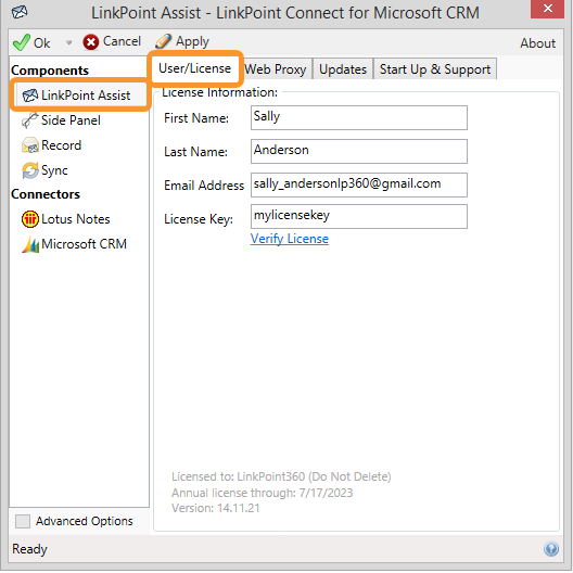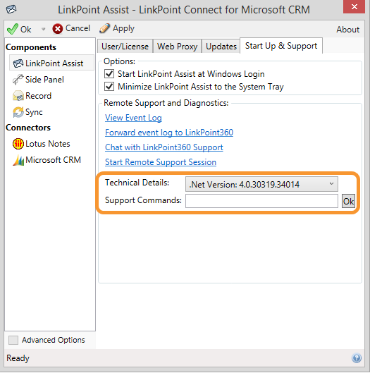 LinkPoint Assist guides users through simple configuration processes to adapt LinkPoint Connect to individual and organizational needs. Various settings are available for managing the way that LinkPoint Connect for Microsoft Dynamics CRM displays CRM data, records emails, and syncs information between systems. There are also several useful connectors available for advanced users who want to include even more integration within their LinkPoint Connect Side Panel. In this section, you will learn how to configure general LinkPoint Assist settings for managing License Key, Web Proxy, Updates, and Support.