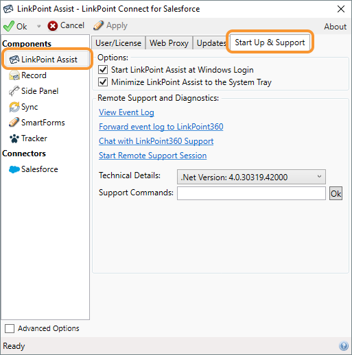 Select LinkPoint Assist from the Components list on the left side of the LinkPoint Assist window, and then select the Start Up & Support tab.