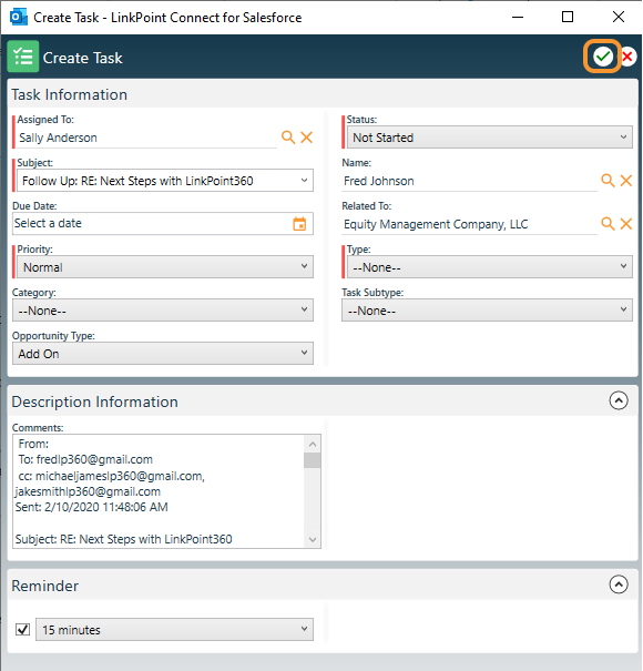 Review the SnapForm. Note that some fields such as Subject, Description, and related records have been prepopulated based on the email content. Edit as needed, complete all required fields, and click the green checkmark to create the item in Salesforce.