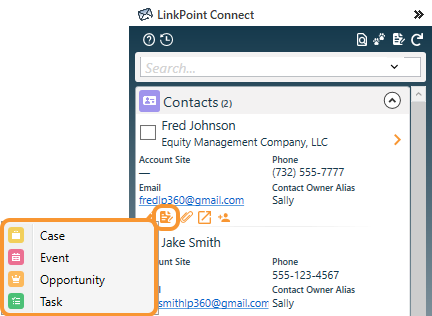 Create new records for standard and custom Salesforce objects from Outlook with SnapForms. LinkPoint Connect automatically detects the user’s Salesforce objects and provides access to SnapForms for those objects. SnapForms display the fields for the object as they appear in the user’s instance of Salesforce and support required and dependent fields. Where applicable, SnapForms present the record types available for an object in a drop-down list.