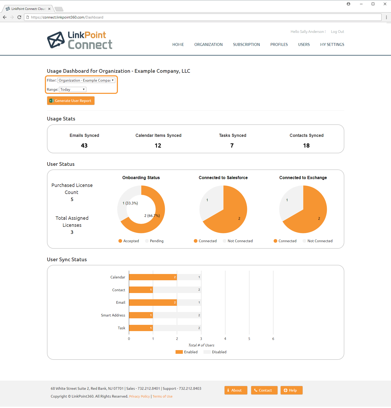 Admins can download a full User Report as an Excel file containing per-user details. This report is accessible on the Usage Dashboard and can be filtered to show specific metrics. User Reports help Admins identify users who need connection assistance or who have larger numbers of Unresolved Items that could benefit from coaching or guidance to create the right data in Salesforce. The report also includes totals that can be added up to realize the time and effort saved with an auto-sync solution. In this section, you will learn how to create a User Report.