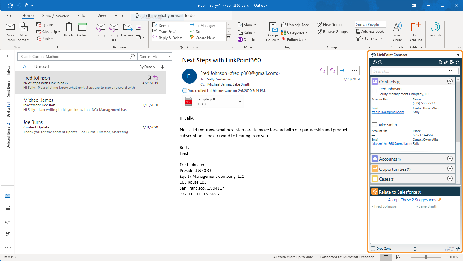 Remain in Outlook and work with Salesforce data in real time. The Side Panel presents related records based on sender and/or recipient email addresses. Users can create or edit data, record emails, view record details, and take additional action on Salesforce records from the Side Panel. The Side Panel can be expanded or collapsed to allow for additional desktop space.