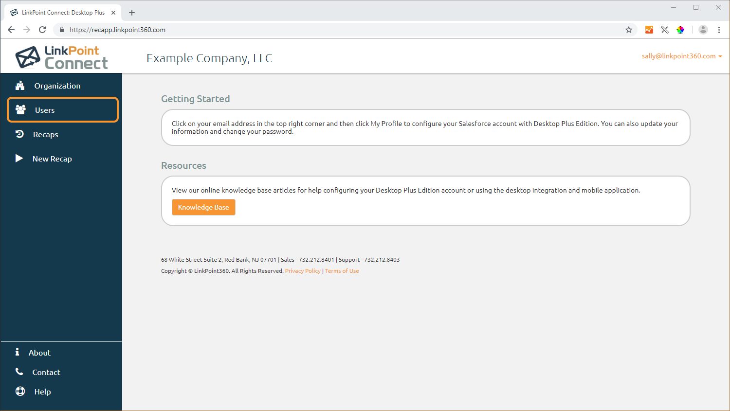 Desktop Plus Edition Admins can review and manage users throughout the system to ensure that the correct users have access to Meeting Recap. Each user is invited to participate via an automated email from the system. The user is prompted to connect their Microsoft Exchange and Salesforce accounts via the Setup Wizard and to download the LinkPoint Connect: Desktop Plus application to their mobile device. Each user can be enabled or disabled by the Organization Admin via the web portal. In this section, you will become familiar with the available options for user management.