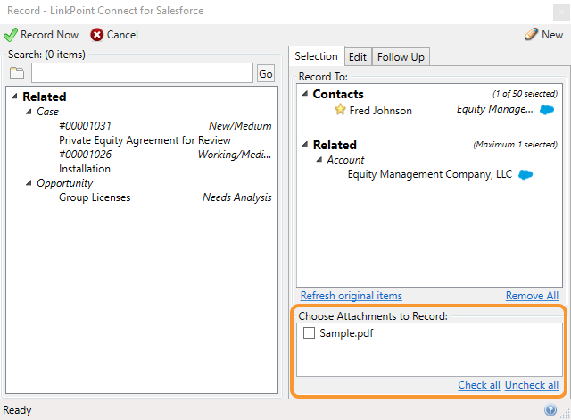 LinkPoint Connect users are able to record emails to Salesforce without the hassle of copying and pasting data between systems. Users can also work with attachments when recording emails to Salesforce. In this section, you will learn how to record attachments to Salesforce from Outlook.