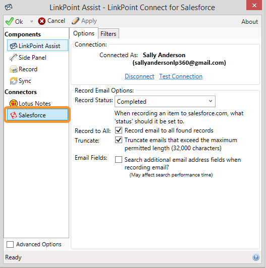 By default, LinkPoint Connect searches for matching Contacts and Leads within Salesforce based on primary email address in order to display matches in the Side Panel and Record window. But in many cases, a single contact may have multiple email addresses. If a user receives an email from an existing contact and LinkPoint Connect does not return a matching contact, it is possible that the contact may be in Salesforce under a secondary email address. Users can now enable secondary email address searching within LinkPoint Connect to make it easier to find contacts with several email addresses on file. In this section, you will learn how to enable and disable the setting that manages LinkPoint Connect email search fields.