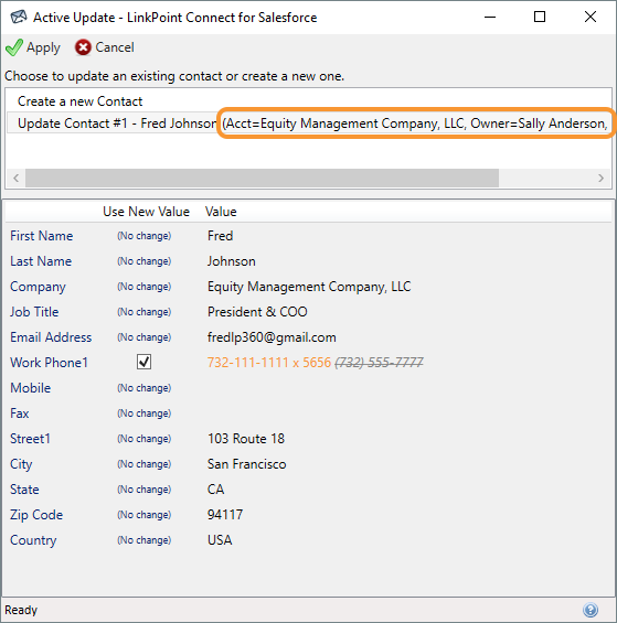 Review the Contact information in the Active Update window. LinkPoint Connect will search Salesforce, identify matching records, and list the records in the top portion of the window.