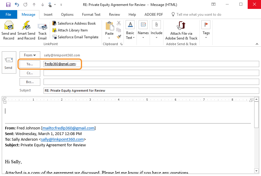 Tip: You can insert information into the template for only one Contact. If you have multiple recipients on the email, you will have to manually select which Contact’s information should be used for the merge fields. LinkPoint Connect will display all matching Salesforce records based on the recipients on the actual email.